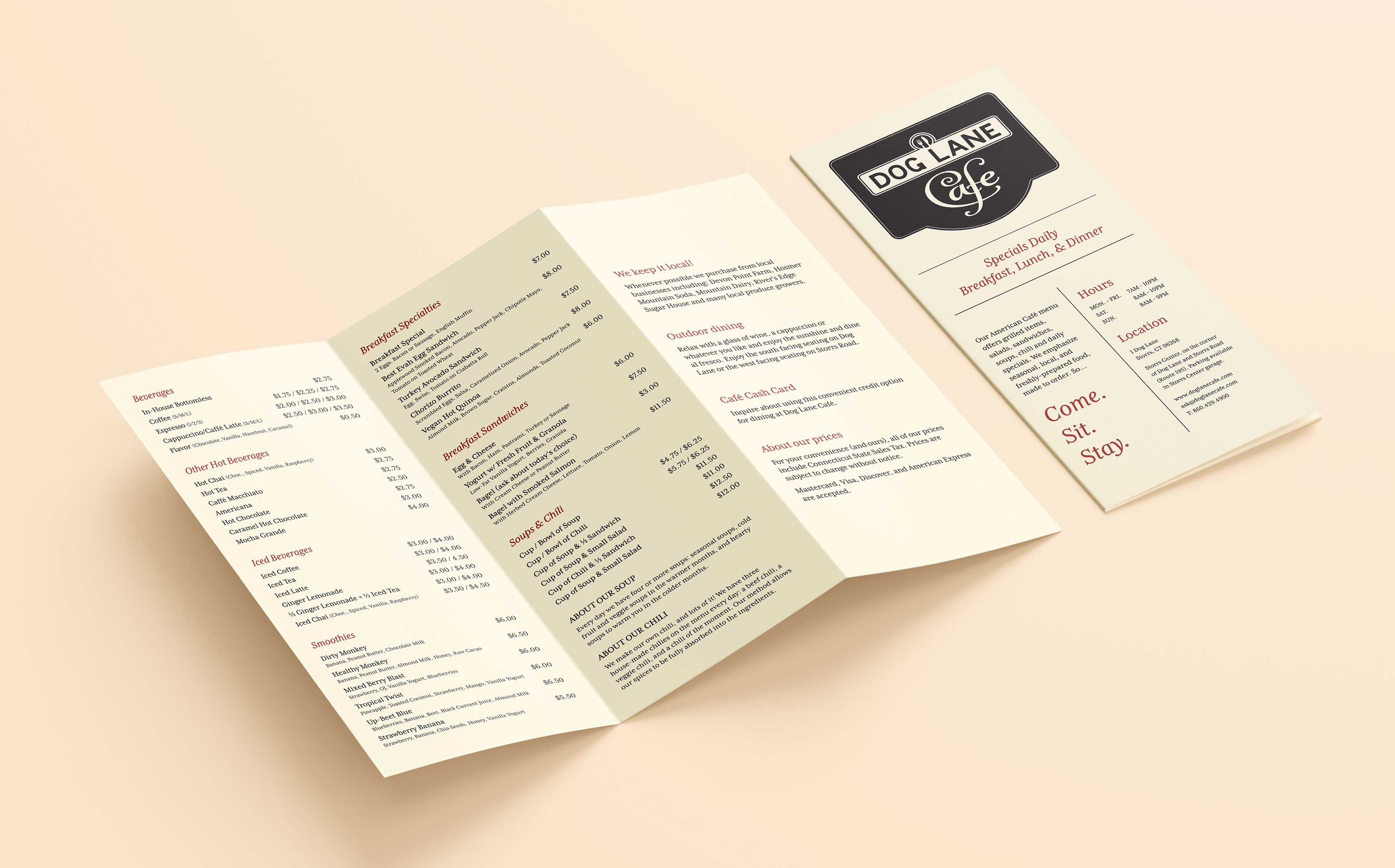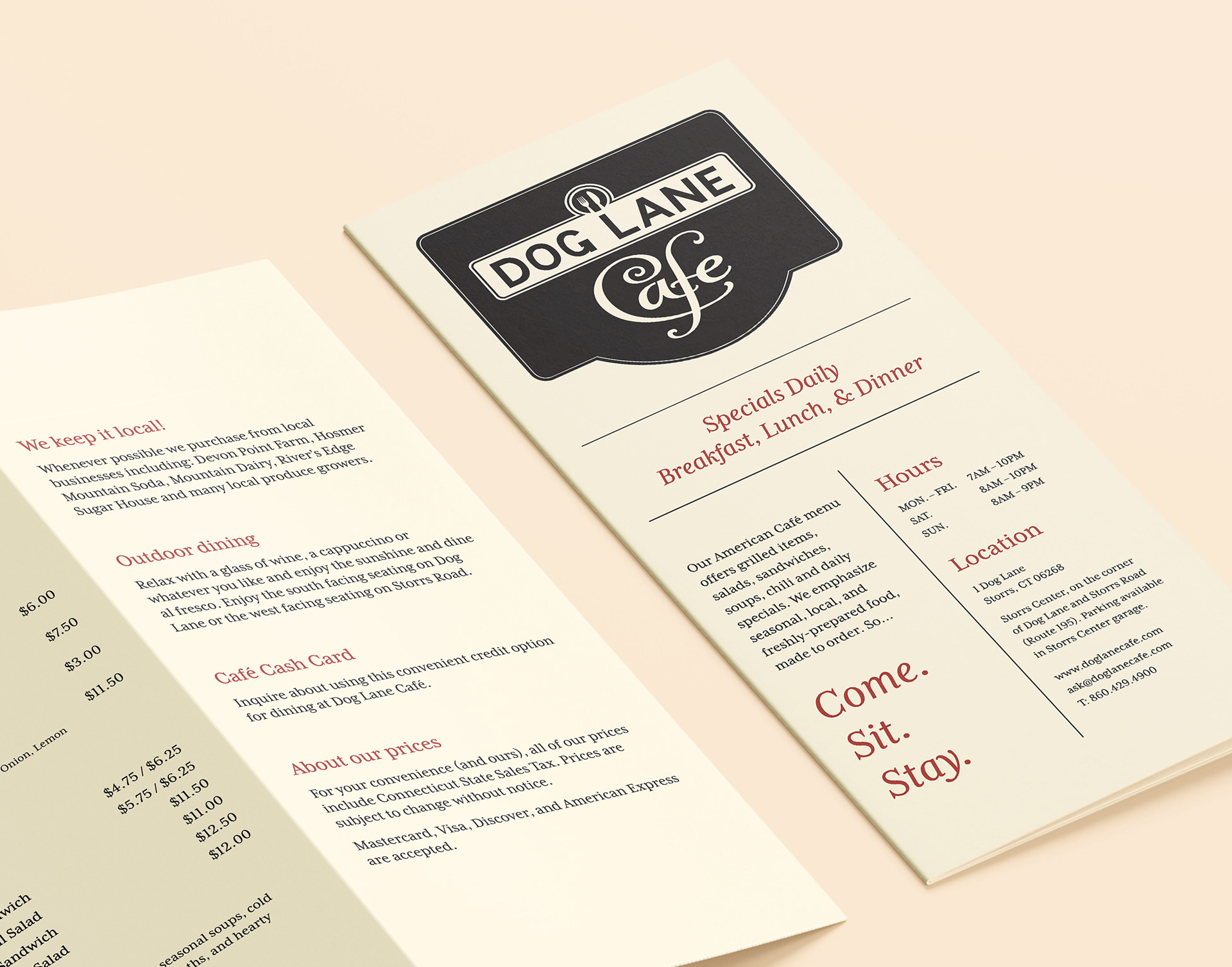 I was responsible for the redesign of the menu, logo refinement, and visual identity style guide for Dog Lane Café in Storrs, CT, originally a client of UConn's Design Center studio. I chose fonts within the Mrs Eaves typeface, particularly the italic, to pair with the calligraphic treatment in the logo. I balanced the intentional off-white and off-black with a secondary red to maintain a simple and hearty color palette.