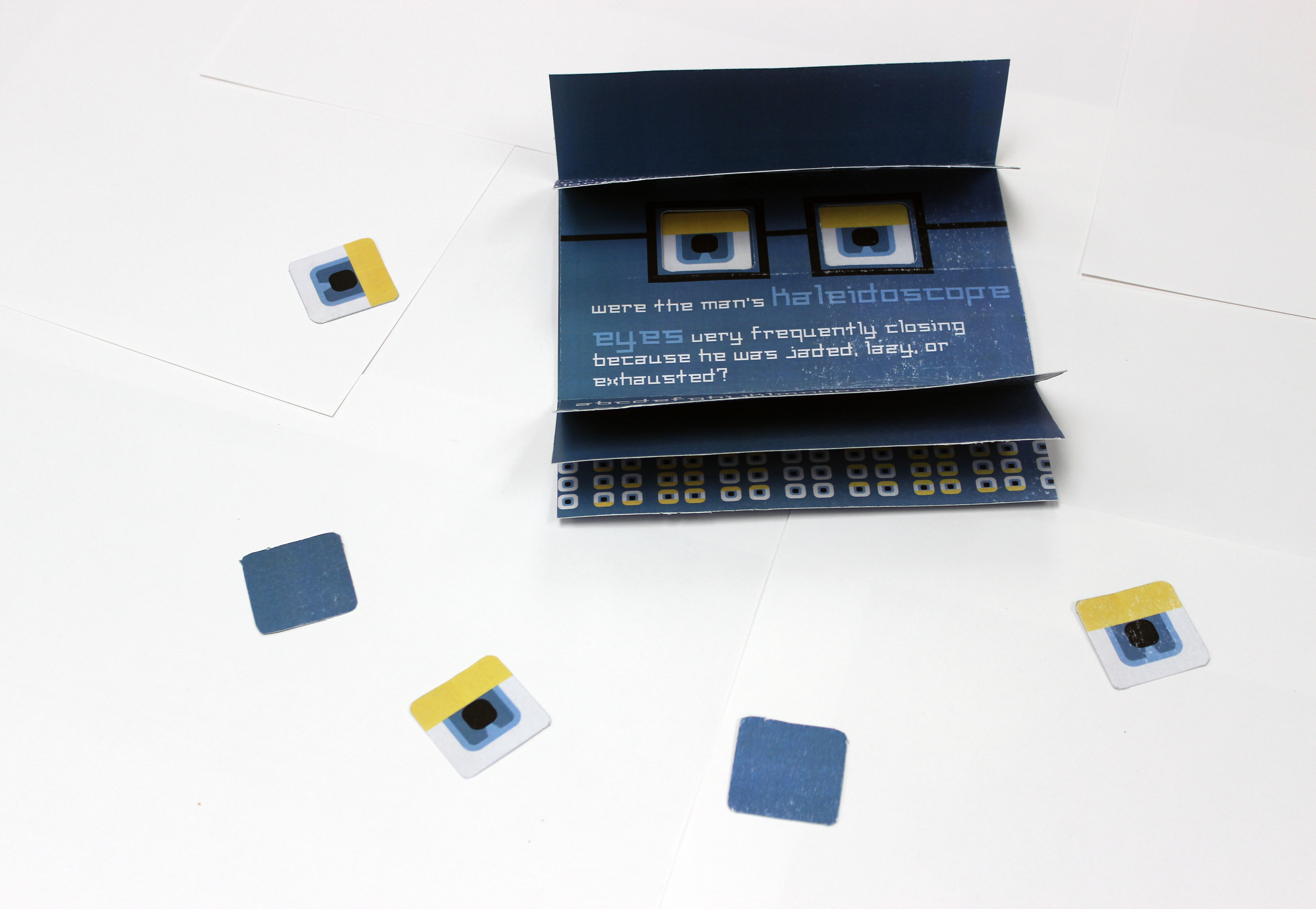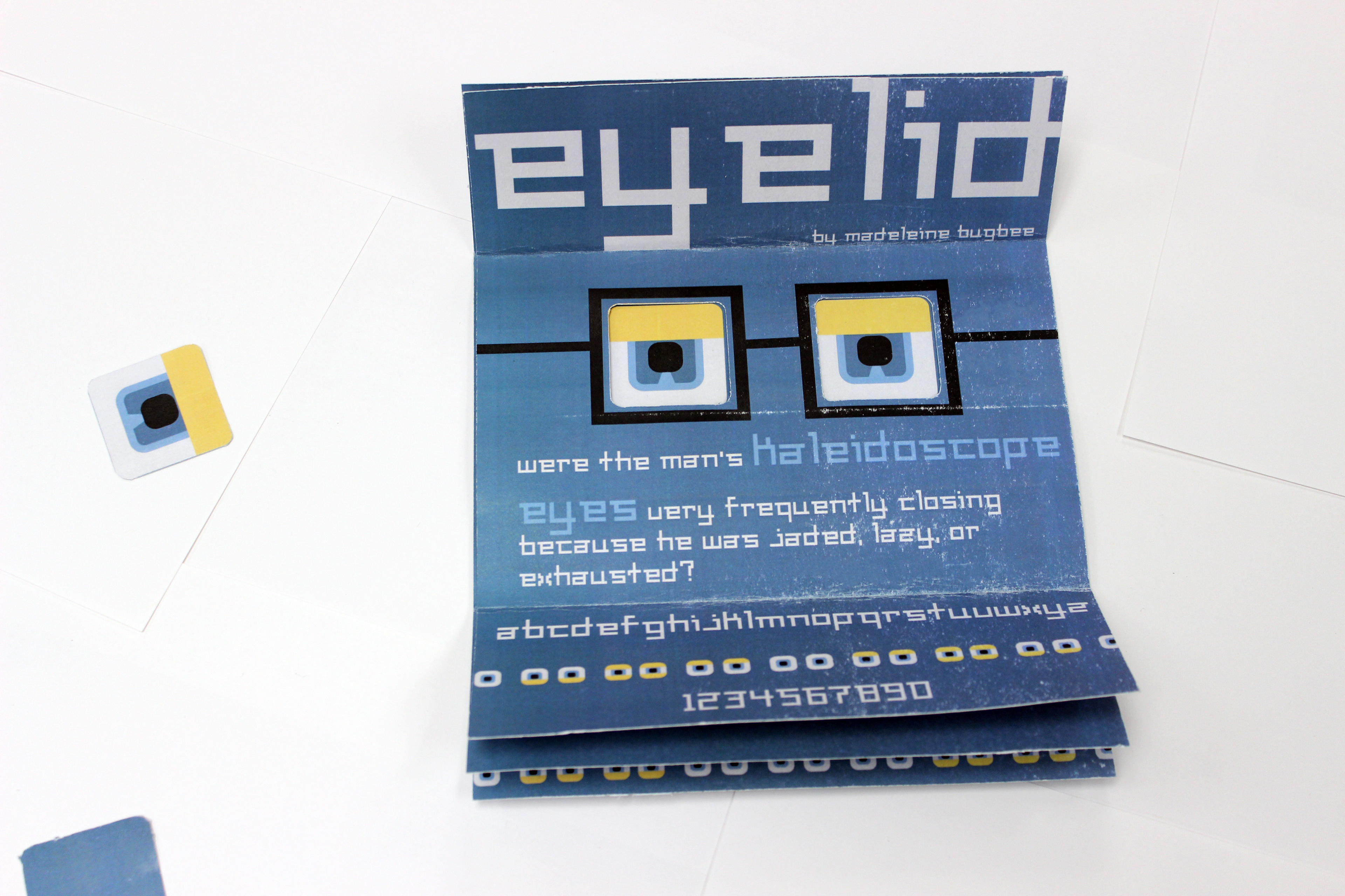 I created an original typeface using a grid and Fontself. I arrived at the name Eyelid because of the overhangs on the letterforms. Once the typeface was established, I created an eye-themed type specimen booklet.