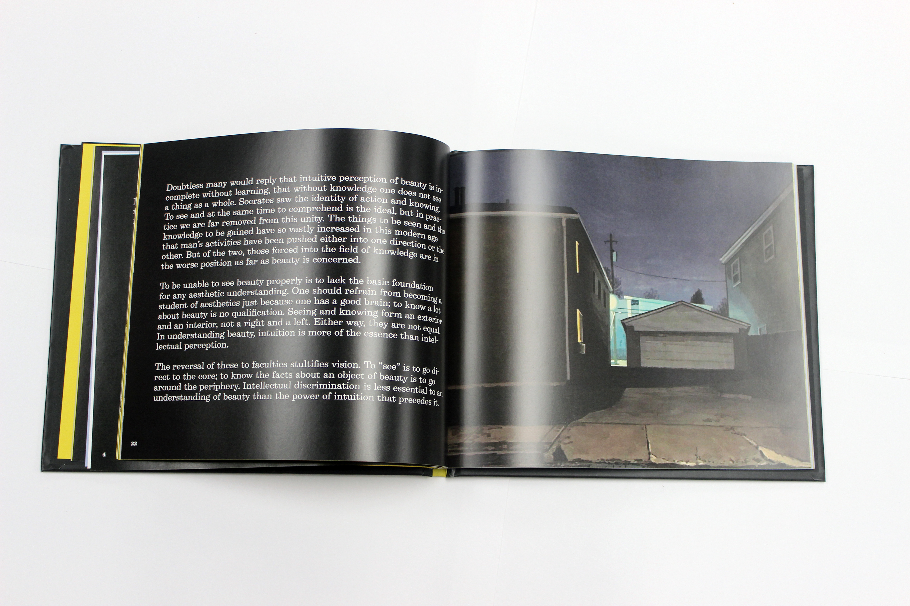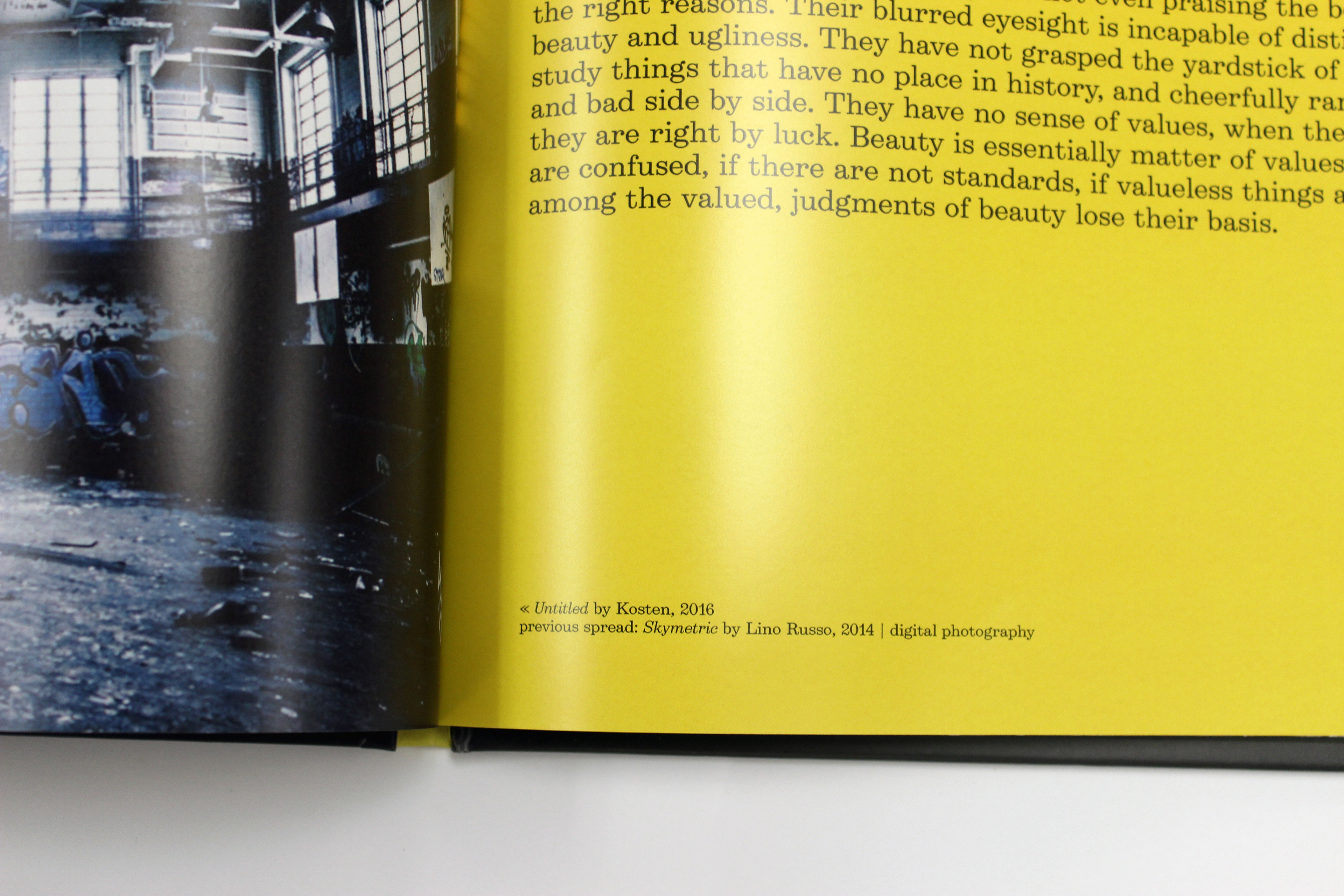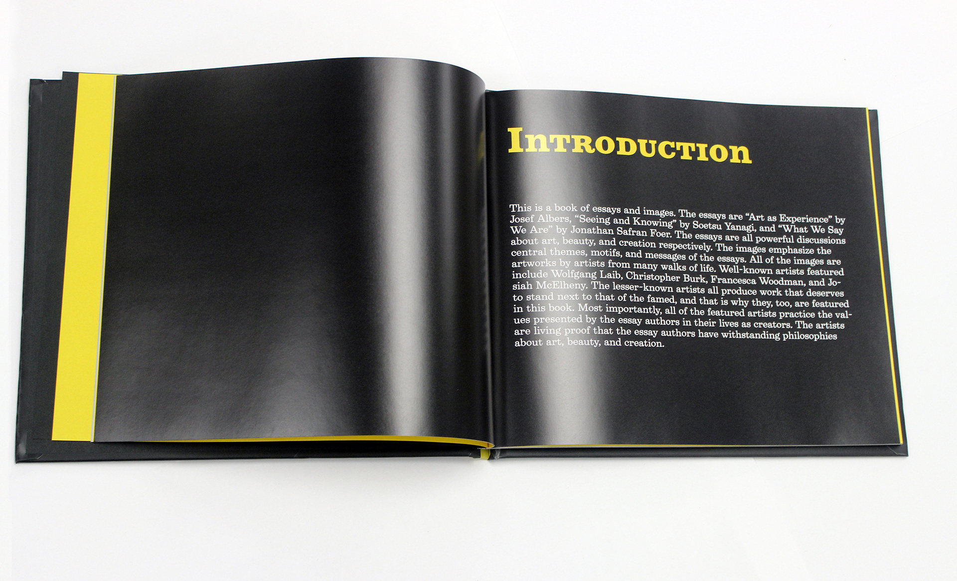 Book design project using three essays as the content and imagery of my choice. The essays are "Art as Experience" by Josef Albers, "Seeing and Knowing" by Soetsu Yanagi, and "What We Say We Are" by Jonathan Safran Foer.